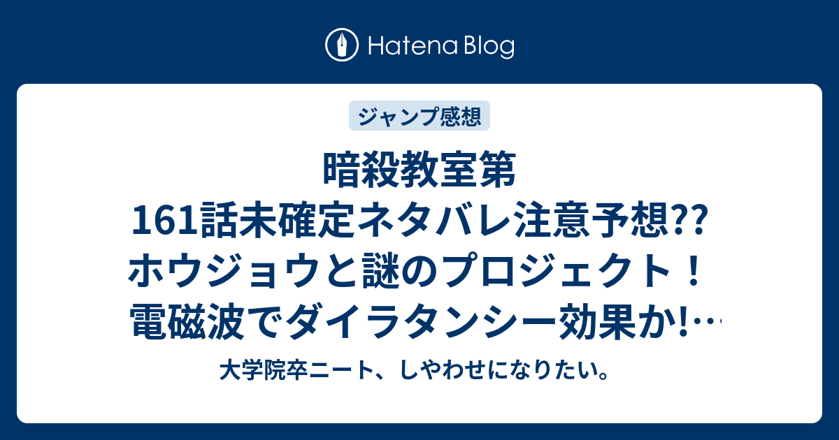 暗殺教室第161話未確定ネタバレ注意予想 ホウジョウと謎のプロジェクト 電磁波でダイラタンシー効果か 162話でシロ 死神がホウジョウを殺す こちらジャンプ感想次回 画バレないよ 大学院卒ニート しやわせになりたい